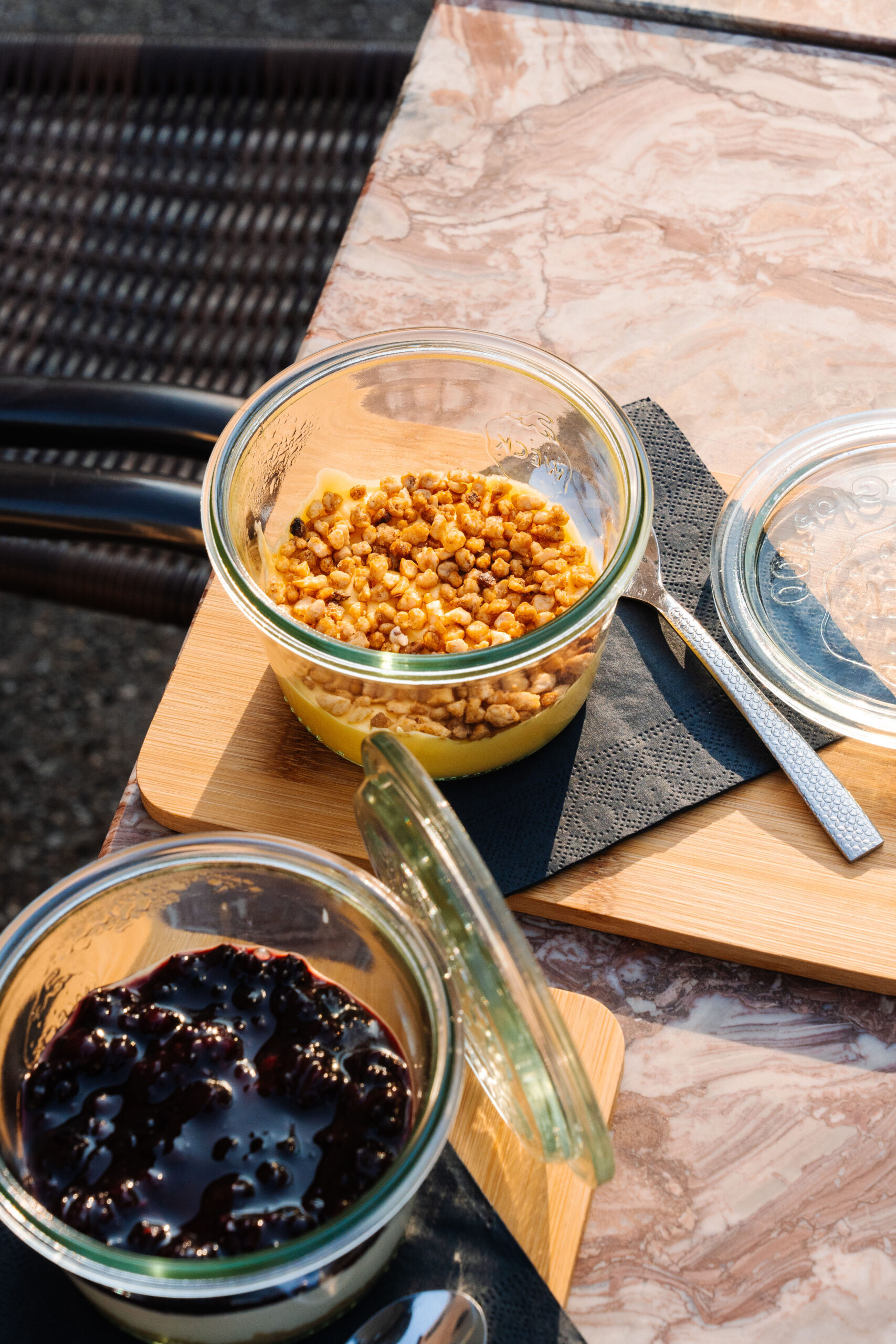 Con stracciatella e finitura di pane sbriciolato alle olive nere